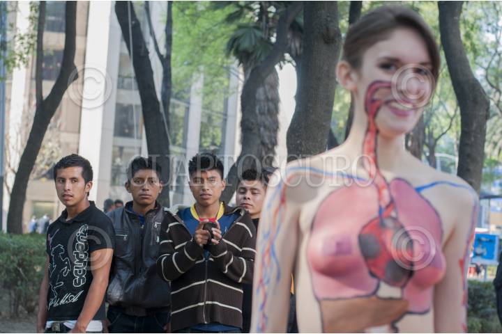 MÉXICO, D.F., 16ENERO2013.- Con desnudes y pintura corporal, organizaciones civiles como: La Red por los Derechos de la Infancia, Bicitekas, Red Nacional de Ciclismo Urbano y El Poder del Consumidor; iniciaron una campaña pública de información sobre el aumento de enfermedades respiratorias y cardiovasculares por respirar aire contaminado diariamente. Según informaron los organizadores, el aire contaminado sigue causando la muerte de 14,700 mexicanos cada año, de acuerdo con la OMS, por eso la necesidad de tener y perseguir los límites de contaminantes en la ciudad. FOTO: DIEGO SIMÓN SÁNCHEZ /CUARTOSCURO.COM