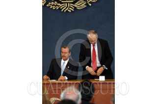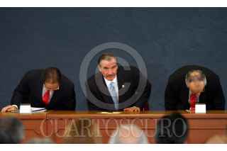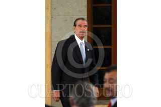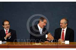MEXICO, D.F. 04JULIO2005.- El presidente Vicente Fox, y el secretario de hacienda y Crédito Público, Francisco Gil Díaz, al finalizar la ceremonia de la firma el decreto promulgatorio de las reformas y adiciones a las leyes de adquisiciones y obras públicas. FOTO: Sandra Perdomo/CUARTOSCURO.COM