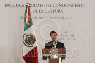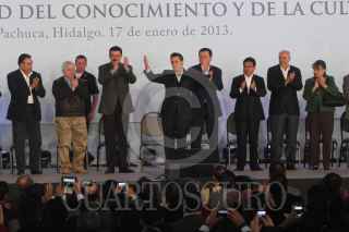 PACHUCA, HIDALGO 17ENERO2013.- El Presidente de México Enrique Peña Nieto encabezó la presentación del programa "Pachuca, Ciudad del Conocimiento y de la Cultura", un campus dedicado a la investigación y desarrollo de tecnología, y un evento donde participaron alrededor de cinco mil personas, el jefe del ejecutivo destacó que la inversión en educación y en investigación permitirá elevar los niveles de productividad en el país. En el evento estuvieron presentes el secretario de Educación, Emilio Chuayfett, el secretario de Gobernación, Miguel ángel Osorio Chong, y el gobernador de la entidad José Francisco Olvera Ruíz. FOTO: PRESIDENCIA /CUARTOSCURO.COM