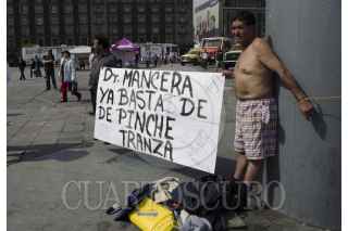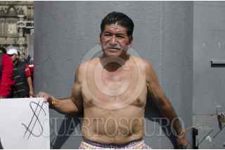 MÉXICO, D.F., 18ENERO2013.- El comerciante Maximino Jiménez Lazaro, secretario de actas y acuerdos de la organización Unificación Nacional Francisco Villa, se manifestó en la Plaza de la Constitución del zócalo capitalino porque no se ha llegado a un acuerdo con el programa delegacional de quitar cuatro espacios que están de más afuera del Auditorio Nacional; mencionó que éste problema ya tiene un año y medio, así como también declaro que comenzará una huelga de hambre hasta que se le de una solución. FOTO: SANDRA PÉREZ /CUARTOSCURO.COM