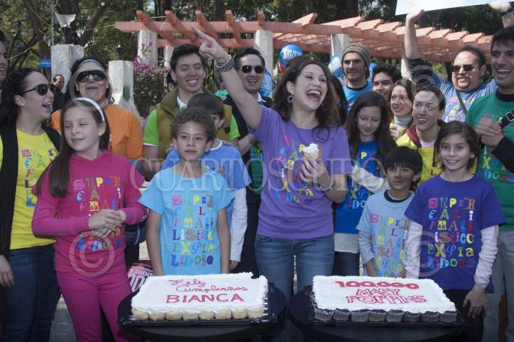 MÉXICO, D.F., 19ENERO2013.- La cantante, bailarina y actríz, Bianca Marroqui, celebró su cumpleaños con sus compañeros de la compañia de la obra de teeatro musical "Mary popins" la cual también celebró los 100 mil espectadores. La protagonista de la celebre obra, corto un pastel que le organizó la compañia de teatros OCESA, además de que hizo un paseo en bicicleta sobre el Parque México. FOTO: FRANCISCO RODRÍGUEZ /CUARTOSCURO.COM