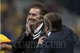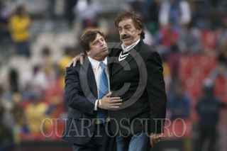 MÉXICO, D.F., 19ENERO2013.- Miguel Herrera, director técnico del América, consuela a su maestro Ricardo Lavolpe, director del Atlante, al finalizar el duelo entre sus escuadras en el Estadio Azteca, las Águilas se impusieron 4-0. FOTO: MISAEL VALTIERRA /CUARTOSCURO.COM