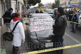 NEZAHUALCOYOTL, ESTADO DE MÉXICO, 20ENERO2013.- Un joven fue hallado sin vida al interior de un auto Chevy con un disparo en la cabeza y con una manta que contenía un mensaje en el cofre sobre la avenida Tepozanes entre calle 2 y Álamos de la colonia La Perla. FOTO: LUIS CARBAYO /CUARTOSCURO.COM