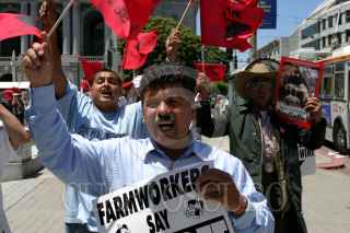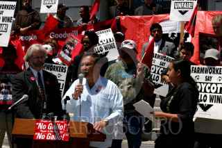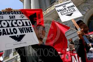 SAN FRANCISCO, CALIFORNIA, EUA. 05 de Julio de 2005.- Trabajadores campesinos y sus apoyadores se manifiestan en frente del palacio muncipal de San Francisco, y lanzan un boicoteo de los vinos de Gallo, la compañia de vino mas grande del mundo, porque Gallo rehusa de negociar un contrato colectivo justo con el Sindicato de Trabajadores Campesinos (UFW). FOTO: David Bacon/CUARTOSCURO.COM