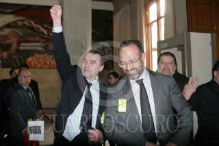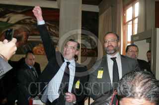 MÉXICO, D.F. 23ENERO2013.-Frank Berton y Agustín Acosta, abogados de Florence Cassez, festejan la resolución a favor de los Magistrados de la primera Sala en la Suprema Corte de Justicia de la Nación (SCJN) luego de varios años de permanecer acusada de pertenecer al grupo de secuestradores "Los Zodiaco" y por ello presa en el penal femenil de Tepepan al Sur de la ciudad. FOTO: JUAN PABLO ZAMORA /CUARTOSCURO.COM