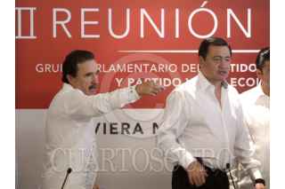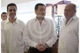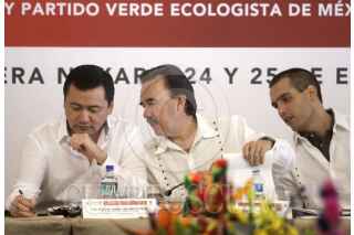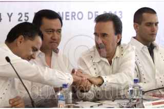 NUEVO VALLARTA, NAYARIT, 24ENERO2013.- Roberto Sandoval, gobernador de Nayarit; Miguel Osorio Chong, Secretario de Gobernación; Emilio Gamboa Patrón, coordinador del PRI en el Senado; y Emilio González Martínez, coordinador del Partido Verde en el Senado; durante la mesa de análisis sobre política interior durante la II Reunión Plenaria del Grupo Parlamentario del PRI en el Senado de la República en el Hotel Mayan Palace de la Riviera Nayarit. FOTO: IVAN STEPHENS /CUARTOSCURO.COM