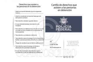 MÉXICO, D.F., 25ENERO2013.- La Secretaría de Gobernación dió a conocer la cartilla de derechos que asisten a las personas en detención que deberá aplicar la Policía Federal. Este documento esta compuesto por nueve puntos 1. Usted se encuentra detenido (a) por los sigueintes motivios. 2 Usted es considerado (a) inocente, hasta que se le demuestre los contrario. 3. Tiene derecho a declarar o guardar silencio. 4. En caso de decidir declarar, tiene derecho a no inculparse. 5. Tiene derecho a un defensor de su elección, en caso de no contar con uno, el Estado se lo proporcionará de manera gratuita. 6. Tiene derecho a un traductor e intérprete. 7. Tiene derecho a que se le ponga en conocimiento de un familiar o persona que desee, el hecho de su detención y el lugar de custodia en que se halle en cada momento. 8. Tiene derecho a que se le ponga, sin demora, a disposición de la autoridad competente. 9. En caso de ser extranjero, tiene derecho a que el consulado de su país sea notificado de su detención. FOTO: SEGOB /CUARTOSCURO.COM