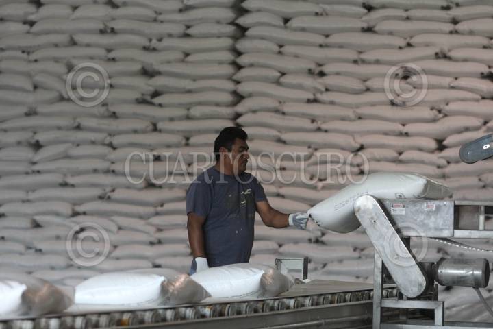 ZACATEPEC, MORELOS., 25ENERO2013.- Toneladas de costales de azúcar fueron trasladados a la cancha Morelos, que pertenece al Ingenio azucarero ‘Emiliano Zapata’ de Zacatepec; debido a que las bodegas de dicho ingenio se encuentran a su maxima capacidad. Cañeros morelenses mantienen guardias a las afueras de las bodegas del Ingenio ante la falta de respuesta de las autoridades para estabilizar el precio del azúcar. FOTO: SAÚL LÓPEZ / CUARTOSCURO.COM