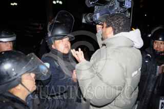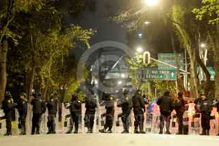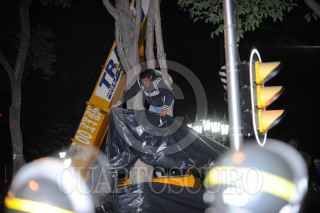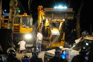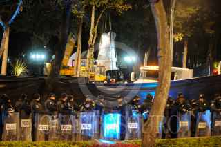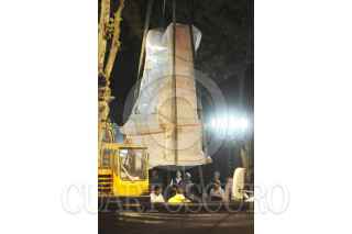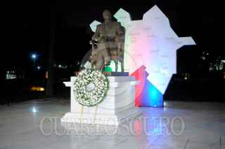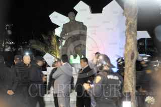 MÉXICO, D.F., 26ENERO2013.- Con un fuerte dispositivo de seguridad por parte de granaderos de la Secretaría de Seguridad Pública del DF el gobierno capitalino retiro la estatua del Heydar Aliyev, ex-presidente de Azerbaiyán acusado de ser un dictador. La efigie inaugurada el 22 de agosto de 2012 por el entonces Jefe de Gobierno Marcelo Ebrard y ubicada en el Parque de la Amistad en Paseo de la Reforma, se vió envuelta en la polémica tras su rechazo por un grupo de intelectuales, hay que recordar que el gobierno azerbayense invirtió 65 millones en la remodelación del Parque de la Amistad y en la Plaza de Tlaxcoaque, y advirtió de desistir en sus inversiones en la capital si la estatua era retirada, tras una serie de negociaciones por parte de Cuauhtémoc Cárdenas, coordinador de asuntos internacionales del GDF, quien advirtió que la figura de este líder no honra de ninguna manera la ciudad de México, se tomó esta decisión. La figura de bronce fue movida por la madrugada, antes de comenzar los trabajos fueron colocadas mantas negras y un cerco de seguridad para que la prensa no pudiera acercarse, el destino final de esta mal lograda escultura será por el momento unas bodegas de Seduvi, ubicadas en la delegación Azcapotzalco. FOTO: LUIS CARBAYO /CUARTOSCURO.COM