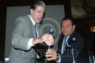 MEXICO, D.F. 06JULIO2005.- El secretario de Salud, Julio Frenk Mora, y el productor de televisión Salvador Mejía durante la entrega del donativo al Instituto Nacional de Cancerología para ayudar a combatir el cáncer de mama por parte del elenco de la telenovela "La madrastra". FOTO:Iván Stephens/CUARTOSCURO.COM