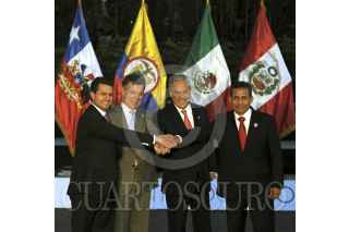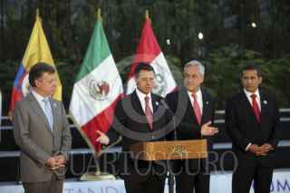 SANTIAGO DE CHILE, CHILE, 28ENERO2013.- Luego de una reunión de los Mandatarios que conforman la Alianza del Pacífico, Colombia, Chile, Perú y México, los presidentes Juan Manuel Santos, Enrique Peña Nieto, Sebastián Piñera Echenique y Ollanta Humala, realizaron conferencia de prensa. Informaron como unos de los acuerdos alcanzados entre los cuatro países fue el acuerdo arancelario antes del 31 de marzo de este año, por el cual por lo menos el 90 por ciento de los productos quedarán liberados de todo tipo de arancel en el comercio entre los países que integran la Alianza del Pacífico. FOTO: PRESIDENCIA /CUARTOSCURO.COM