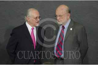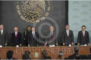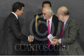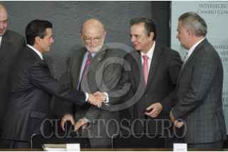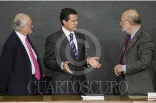 MÉXICO, D.F., 29ENERO2013.- Enrique Peña Nieto, Presidente de México, conversa con Mario Molina, premio nobel de química y José Sarukhan, ex-rector de la UNAM, durante la instalación de la comisión de cambio climático, en la residencia de Los Pinos. FOTO: MISAEL VALTIERRA /CUARTOSCURO.COM