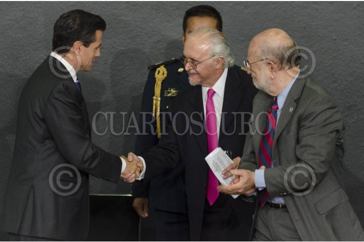 MÉXICO, D.F., 29ENERO2013.- Enrique Peña Nieto, Presidente de México, conversa con Mario Molina, premio nobel de química y José Sarukhan, ex-rector de la UNAM, durante la instalación de la comisión de cambio climático, en la residencia de Los Pinos. FOTO: MISAEL VALTIERRA /CUARTOSCURO.COM