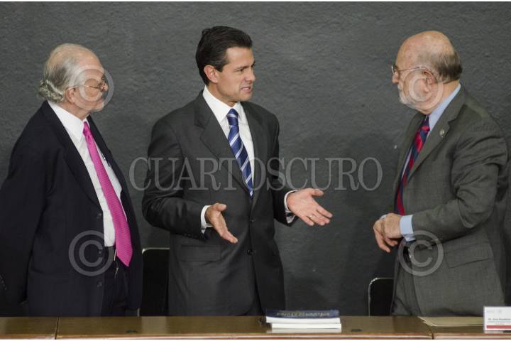 MÉXICO, D.F., 29ENERO2013.- Enrique Peña Nieto, Presidente de México, conversa con Mario Molina, premio nobel de química y José Sarukhan, ex-rector de la UNAM, durante la instalación de la comisión de cambio climático, en la residencia de Los Pinos. FOTO: MISAEL VALTIERRA /CUARTOSCURO.COM