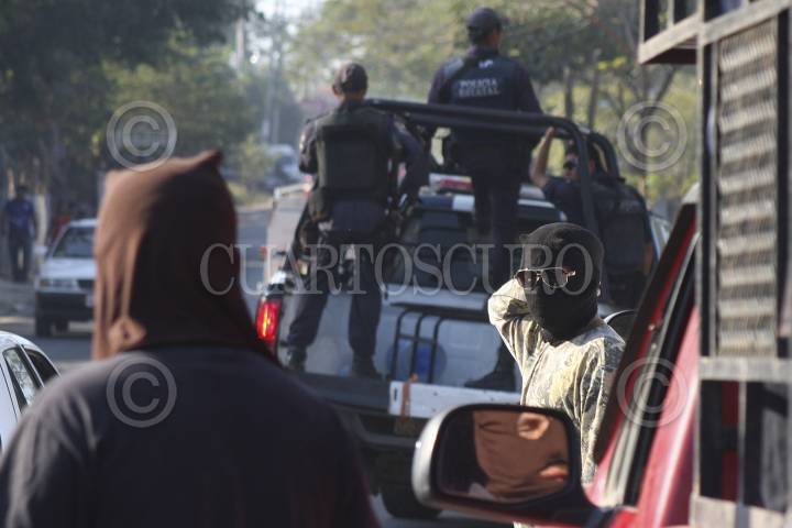 AYUTLA, GUERRERO, 31ENERO2013.- La Unión de los Pueblos y Organizaciones del Estado de Guerrero inicio el juicio en contra de las 54 personas detenidas por la policía comunitaria de Ayutla. Por la mañana hubo una movilización por parte de varios grupos de hombre armados que integran los comités de vigilancia en otras localidades. Entre las personas que van ser enjuiciadas se encuentras la mamá, el papá, dos hermanos y la pareja sentimental del supuesto líder de plaza del municipio de Ayutla, identificado como "El Cholo". Entre los detenidos están tres mujeres y cuatro menores edad, el juicio se realiza en la explanada del municipio. FOTO: ALMA LAFAYET /CUARTOSCURO.COM