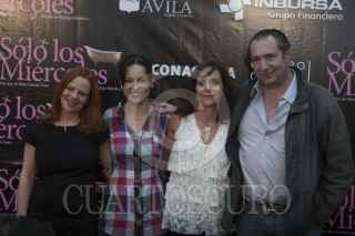 MÉXICO, D.F., 31ENERO2013.- La escritora, María Antonia Yanes, las actrices, Gaby Platas y Luz María Yanes y el director de la obra, Rodrigo Mendoza, posan para los fotógrafos al finalizar la conferencia de prensa para anunciar el estreno el 8 de Febrero de la obra "Solo los Miércoles" Escrita por María Antonia Yanes, aborda la historia de "Luisa" interpretada por Luz María Jeréz, una viuda que sufrió una mastectomía y que intenta regresar a su vida normal, la cual incluye a su amante "Joaquín" interpretado por Otto Sirgo, ambos son sorprendidos por las hijas de Luisa por lo que tendra que enfrentarlas al chocar la imagen de madre tradicional recatada que tenían. FOTO: FRANCISCO RODRIGUEZ /CUARTOSCURO.COM