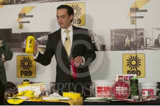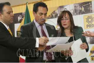 MÉXICO, D.F., 01FEBRERO2013.- El diputado Rosendo Medina Filigrana, Camerino Eleazar Márquez, representante del PRD ante el IFE y Yeidckol Polevnsky, durante la conferencia de prensa que ofreció Xavier Garza Benavides, secretario de Finanzas del PRD, en la sede del partido para detallar aspectos sobre los gastos de campaña entre el PRD y el PRI durante las pasadas elecciones presidenciales, y las recientes resoluciones del IFE por la posible multa al partido de izquierda al declarar que sobrepasaron el presupuesto de campaña de las elecciones del 2012. FOTO: DIEGO SIMÓN SÁNCHEZ / CUARTOSCURO.COM