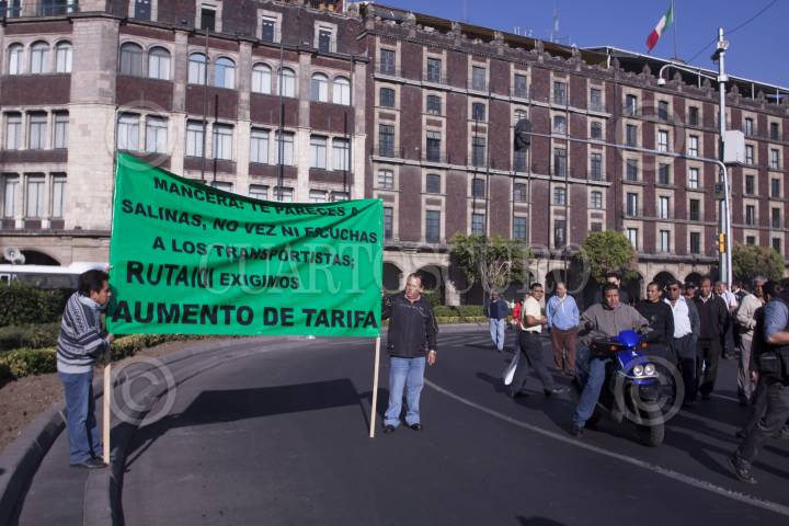MÉXICO, D.F., 06FEBRERO2013.- Chóferes de diversas rutas de transporte público del DF se concentraron en el Zócalo para manifestarse y pedir aumento en las tarifas del pasaje, los inconformes pidieron una audiencia con el Jefe de Gobierno Miguel Ángel Mancera. FOTO: MOISÉS PABLO /CUARTOSCURO.COM