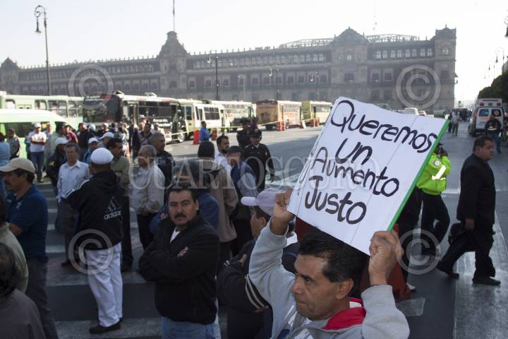 MÉXICO, D.F., 06FEBRERO2013.- Chóferes de diversas rutas de transporte público del DF se concentraron en el Zócalo para manifestarse y pedir aumento en las tarifas del pasaje, los inconformes pidieron una audiencia con el Jefe de Gobierno Miguel Ángel Mancera. FOTO: MOISÉS PABLO /CUARTOSCURO.COM