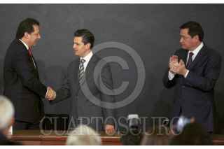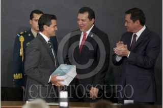 MÉXICO, D.F., 07FEBRERO2013.- Miguel Ángel Osorio Chong, Secretario de Gobernación junto a Enrique Peña Nieto, Presidente de la República y Raúl Plasencia Villanueva, Presidente de la Comisión Nacional de los Derechos Humanos durante la ceremonia de entrega de informes de la CNDH durante el 2012. FOTO: CUARTOSCURO.COM