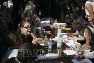 MÉXICO, D.F., 09OCTUBRE2013.- Lucía Laura Muñoz Corona, titular de la Dirección General del Colegio de Ciencias y Humanidades (CCH), y estudiantes del colegio de humanidades instalaron una mesa de diálogo para destrabar el conflicto que se vive en esta escuela. En la mesa los jóvenes entregaron un pliego petitorio en donde piden el desistimiento de los cargos contra sus compañeros, quienes cometieron destrozos en las instalaciones de la dirección el jueves pasado. Los estudiantes se oponen contra la actualización de los planes y programas de estudio, además de la expulsión de seis de sus compañeros. La directora Muñoz Corona señalo que ella no puede hacer nada al respecto de las denuncias levantadas en los Ministerios Públicos. FOTOS: IVÁN MENDEZ /CUARTOSCURO.COM