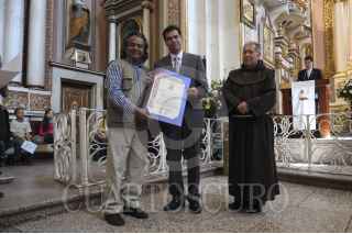 GUADALUPE, ZACATECAS, 10FEBRERO2013.- El fotógrafo y Director de la Agencia y Revista Cuartoscuro, Pedro Valtierra; recibió un reconocimiento por su trayectoria de manos del presidente municipal de Guadalupe, Zacatecas, Rafael Flores; en una ceremonia efectuada dentro del Templo de Guadalupe justo antes de la celebración dominical religiosa. En la foto los acompaña el padre Miguel Encarnación Luna, superior de la orden de los franciscanos. FOTO: JUAN CARLOS BASABE /ESPECIAL /CUARTOSCURO.COM
