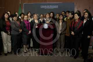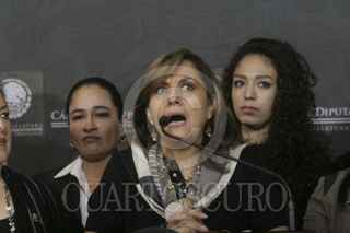 MÉXICO, D.F., 12FEBRERO2013.- Ante la polémica que ha generado las críticas generadas por la vestimenta de la diputada Crystal Tovar, legisladoras de todos los grupos parlamentarios en el Congreso exhortaron a medios de comunicación a eliminar contenidos sexistas y que reproducen la violencia contra las mujeres. En conferencia de prensa, la diputada Martha Lucía Micher, acompañada por una veintena de diputadas y los legisladores José Luis Muñoz y Silvano Aureoles, leyó un exhorto en el que señala que algunos medios de comunicación no especificados, ofenden a varias diputadas por su apariencia o forma de vestir. FOTO: JUAN PABLO ZAMORA /CUARTOSCURO.COM