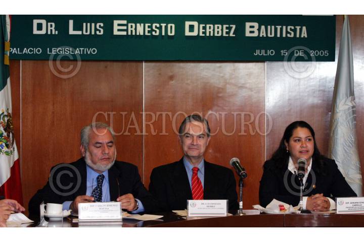 MEXICO, D.F. 15JULIO2005.- Carlos Jiménez Macias, secretario de la comición de relaciones exteriores, Luis Ernesto Derbez Bautista, secretario de relaciones exteriores y Adriana Gonzalez, presidenta de la comición, durante la conferencia de prensa en la camara de diputados. FOTO: Osvaldo Aguilar/CUARTOSCURO.COM