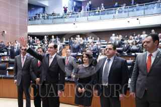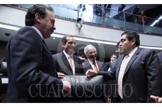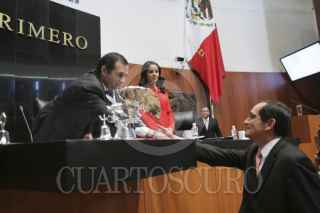 MÉXICO, D.F., 14FEBRERO2013.- Javier Eduardo Guzmán Calafell, subgobernador del Banco de México, saluda al senador del PAN, Ernesto Cordero, en el marco de la toma de protesta del subgobernador ante el pleno de la Cámara Alta del Senado de la República. FOTO: CUARTOSCURO.COM