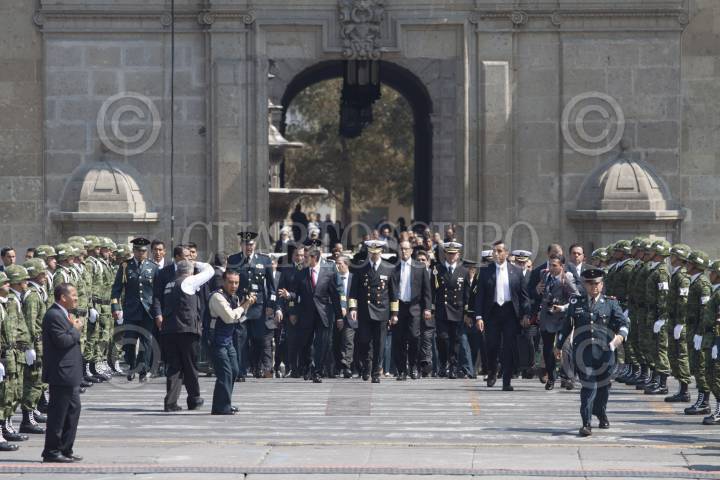 MÉXICO, D.F., 15FEBRERO2013.- Miguel Ángel Mancera, Jefe de Gobierno, Enrique Peña Nieto, Presidente de México, Salvador Cienfuego, secretario de la Defensa, y Vidal Soberón, secretario de Marina, recorrieron la exposición militar "Fuerzas Armadas...Pasión por servir a México", que se encuentra instalada en la plancha del Zócalo. FOTO: MOISÉS PABLO /CUARTOSCURO.COM