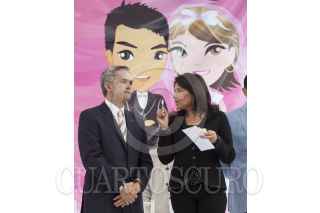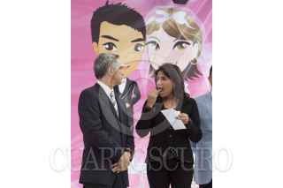 MÉXICO, D.F., 16FEBRERO2013.- Miguel Ángel Mancera, Jefe de Gobierno, y Alejandra Barrales, senadora del PRD, conversan al finalizar la ceremonia en la que se casaron 412 parejas en la explanada delegacional de Iztacalco. FOTO: MOISÉS PABLO /CUARTOSCURO.COM