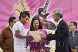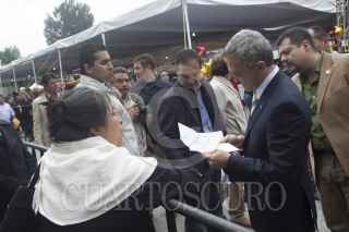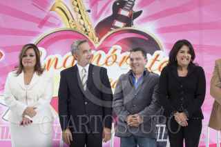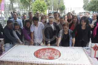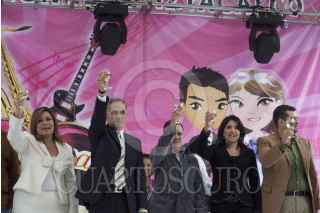MÉXICO, D.F., 16FEBRERO2013.- Las parejas contrayentes en la ceremonia que se realizó en la explanada delegacional de Iztacalco cortan el pastel, acompañados por el Jefe de Gobierno Miguel Ángel Mancera y Alejandra Barrales, senadora del PRD. En la ceremonia 412 parejas se casaron de manera gratuita. FOTO: MOISÉS PABLO /CUARTOSCURO.COM