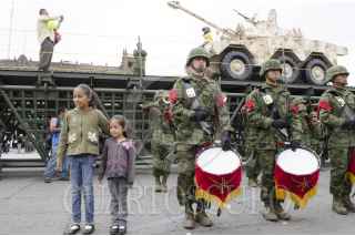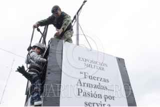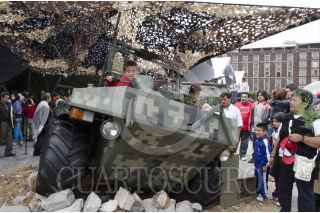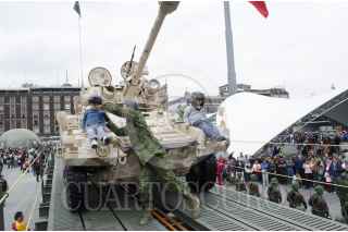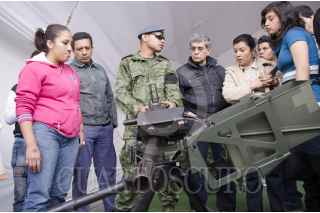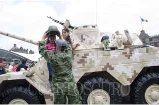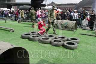 MÉXICO, D.F., 16FEBRERO2013.- Desde el día de ayer y hasta el 6 de marzo permanecerá abierta al público la exposición militar "Fuerzas Armadas... Pasión por servir a México", organizada por la Secretaría de la Defensa Nacional (Sedena) y la Secretaría de Marina. La exposición instalada en el Zócalo de la Ciudad, muestra armamento, vehículos, aeronaves, equipo y estrategias que realizan los soldados de tierra, aire y mar. Se puede interactuar con el equipo y se imparten actividades como tirolesa, escalada y cuidado ambiental. FOTO: JOYCE GARCÍA /CUARTOSCURO.COM