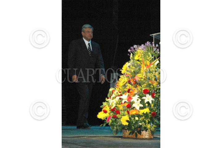 MEXICO, D.F . 17JULIO2005.- José Ramón, hijo del jefe de gobierno local, y Andrés Manuel López Obrador, jefe de gobierno, a su llegada al evento organizado por redes ciudadanas en las que el mandatario local dio a conocer 50 compromisos con los que inicia su campaña proselitista. FOTO: Iván Stephens/CUARTOSCURO.COM