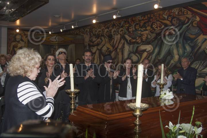 MÉXICO, D.F., 20FEBRERO2013.- Gabriel Cordero hijo del actor, Joaquín Cordero, aplauden al pie del féretro de su padre quien falleciera la tarde de ayer en su casa. El homenaje se llevó a cabo en el vestíbulo de el Teatro Jorge Negrete y se tiene previsto que mañana le realizaen un homenaje en el Palacio de la Bellas Artes. FOTO: FRANCISCO RODRÍGUEZ /CUARTOSCURO.COM