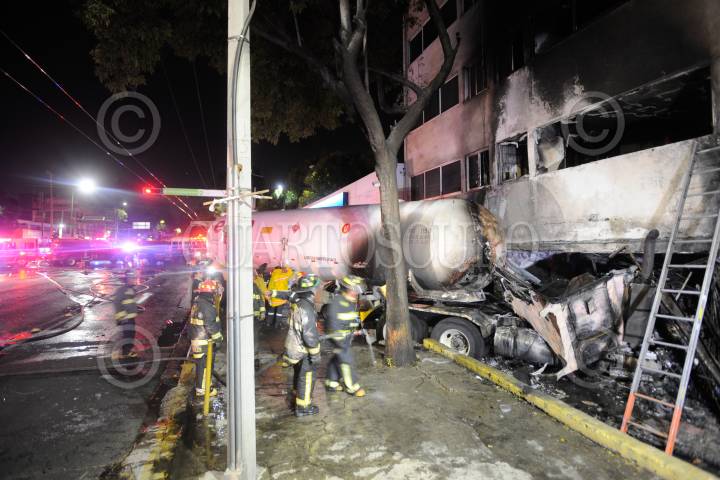MÉXICO, D.F., 23FEBRERO2013.- Una pipa de gas L.P. que trasportaba 44,000 litros de este combustible se impacto contra un edificio de despachos en renta provocando un incendio en cabina de la unidad tipo trailer perdiendo la vida el conductor de este vehículo. Dos autos más, un Derby y un Fiesta, fueron impactados a su paso dejando a los conductores lesionados los cuales fueron trasladados a la Cruz Roja en Polanco. FOTO: LUIS CARBAYO /CUARTOSCURO.COM