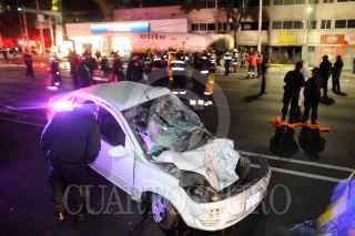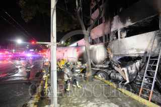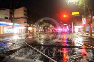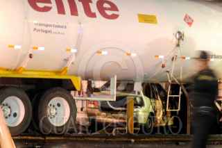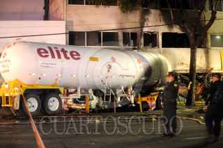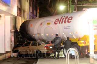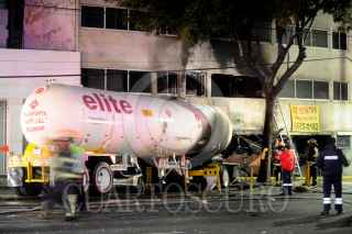 MÉXICO, D.F., 23FEBRERO2013.- Una pipa de gas L.P. que trasportaba 44,000 litros de este combustible se impacto contra un edificio de despachos en renta provocando un incendio en cabina de la unidad tipo trailer perdiendo la vida el conductor de este vehículo. Dos autos más, un Derby y un Fiesta, fueron impactados a su paso dejando a los conductores lesionados los cuales fueron trasladados a la Cruz Roja en Polanco. FOTO: LUIS CARBAYO /CUARTOSCURO.COM