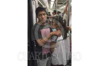 MÉXICO, D.F., 24FEBRERO2013.-Una pareja de jóvenes se abrazan durante su viaje en metro. FOTO: JUAN PABLO ZAMORA /CUARTOSCURO.COM