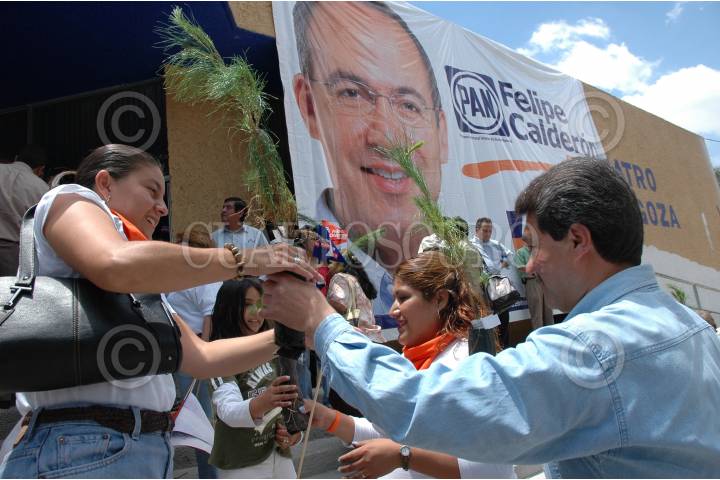 ATIZAPÁN DE ZARAGOZA,EDO. MEX. 23JULIO2005.- Asistentes al acto proselitista realizado en apoyo al precandiadto a la presidencia de la república Felipe Calderón Hinojosa reciben árboles de regalo a su salida del acto. FOTO: Iván Stephens/CUARTOSCURO.COM