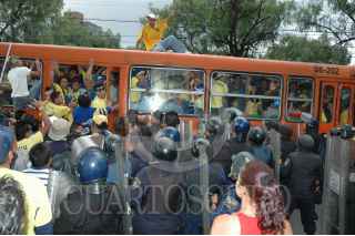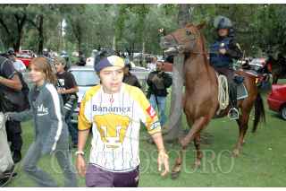 MEXICO, D.F. 23JULIO2005.- Granaderos de la policía montada dispersan a aficionados del equipo de futbol pumas al finalizar el encuentro Pumas-América en el estadio de Ciudad Universitaria. FOTO: Iván Stephens/CUARTOSCURO.COM