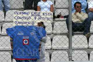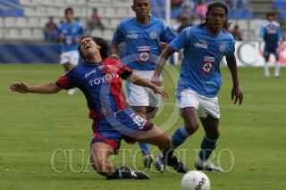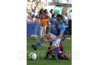 PACHUCA, HIDALGO 23JULIO2005.- Patricio Sebastián Galáz (Atlante) cae al césped ante la marca de Joel Huiqui (Cruz Azul) durante el partido disputado en la entidad en el que Cruz AZul cayó 4 goles a 2 ante los potros de Hierro del Atlante. FOTO: Miguel Dimayuga/CUARTOSCURO.COM