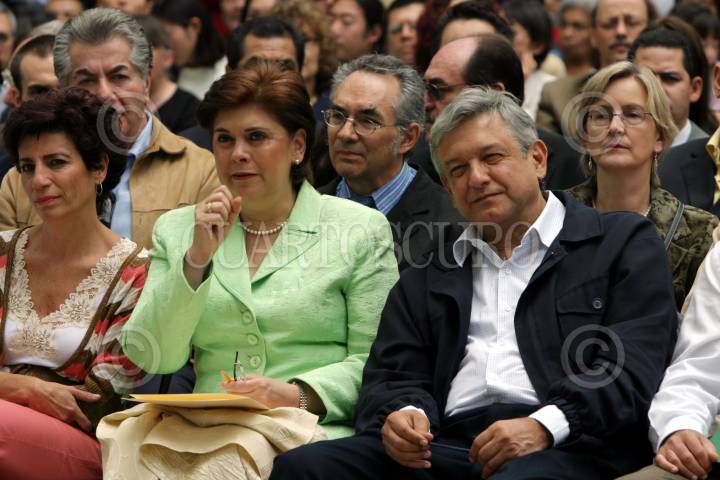 MEXICO, DF 24JULIO2005.- La directora del Conaculta Sari Bermudez y el jefe de gobierno Andrés Manuel López Obrador durante la inaguración de las Campanas que podran ser observadas a lo largo del Paseo de la Reforma. FOTO: Miguel Dimayuga/CUARTOSCURO.COM