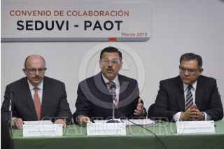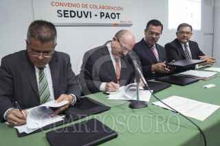 MÉXICO, D.F., 07MARZO2013.- Mario Antonio Esquivel López, Subprocurador de Asuntos Jurídicos de la PAOT; Simón Neuman Ladenzon, Secretario de Desarrollo Urbano y Vivienda; Miguel Ángel Cancino Aguilar, Procurador Ambiental y del Ordenamiento Territorial; y José Guadalupe Medina Romero, Director General de Asuntos Jurídicos de la SEDUVI; durante la firma de convenio de colaboración entre la Secretaría de Desarrollo Urbano y Vivienda (SEDUVI) y la Procuraduría Ambiental y del Ordenamiento Territorial del D.F. (PAOT). FOTO: ADOLFO VALTIERRA /CUARTOSCURO.COM