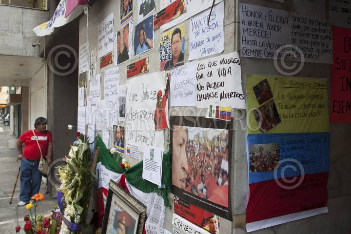 MÉXICO, D.F., 08MARZO2013.- Continúan las muestras de cariño al pueblo venezolano tras la muerte de su presidente Hugo Chávez Frías, quien recibió funerales de estado en el país sudamericano. En las afueras de la embajada de Venezuela se observa un altar en honor a quien en vida funda la llamada "República Bolivariana". FOTO: MOISÉS PABLO /CUARTOSCURO.COM