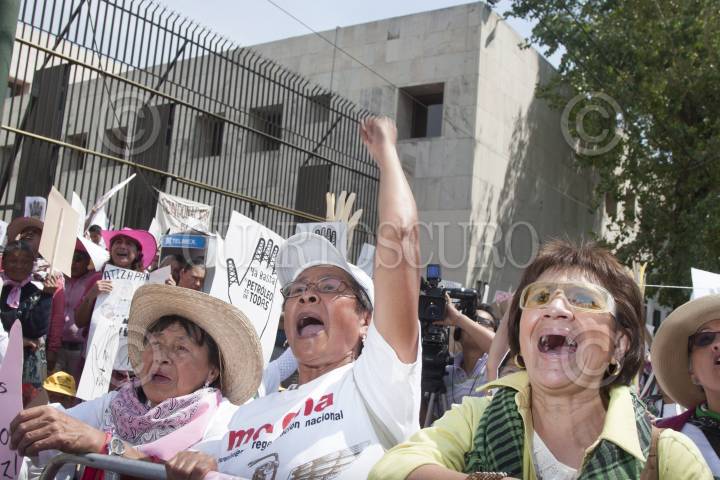 MÉXICO, D.F., 08MARZO2013.- El presidente nacional del Movimiento de Regeneración Nacional MORENA, ofreció un discurso a las puertas del Servicio de Administración Tributaria, para protestar por el intento del PRI de cargar de IVA a los alimentos y medicinas, acompañadas por las "Adelitas" Clara acuso al PRI de violar sus estatutos y querer "exrpimir al pueblo" posterior se realizó una clausura simbólica. FOTO: FRANCISCO RODRÍGUEZ /CUARTOSCURO.COM