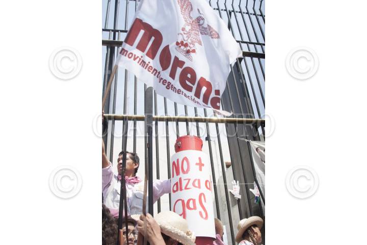MÉXICO, D.F., 08MARZO2013.- El presidente nacional del Movimiento de Regeneración Nacional MORENA, ofreció un discurso a las puertas del Servicio de Administración Tributaria, para protestar por el intento del PRI de cargar de IVA a los alimentos y medicinas, acompañadas por las "Adelitas" Clara acuso al PRI de violar sus estatutos y querer "exrpimir al pueblo" posterior se realizó una clausura simbólica. FOTO: FRANCISCO RODRÍGUEZ /CUARTOSCURO.COM