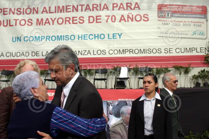 MEXICO, D.F. 26JULIO2005.- Andrés Manuel López Obrador, jefe de Gobierno capitalino, se despide de sus simpatizantes, mientras un adulto mayor le muestra una pancarta en pro de la eutanasia, al tèrmino de la entrega de tarjetas de pensiones. FOTO: Sandra Perdomo/CUARTOSCURO.COM