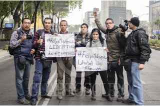 MÉXICO, D.F., 15MARZO2013.- Reporteros gráficos de diferentes medios de comunicación se manifiestan en solidaridad con el fotoperiodista Félix Márquez, corresponsal de la Agencia Cuartoscuro en Veracruz, después de las declaraciones de autoridades Veracruzanas en el cual descalifican las fotografías que el jóven fotógrafo realizó y publicó de un grupo de autodefensa civil en el municipio de Tlalixcoyan, Veracruz. FOTO: IVÁN MÉNDEZ /CUARTOSCURO.COM