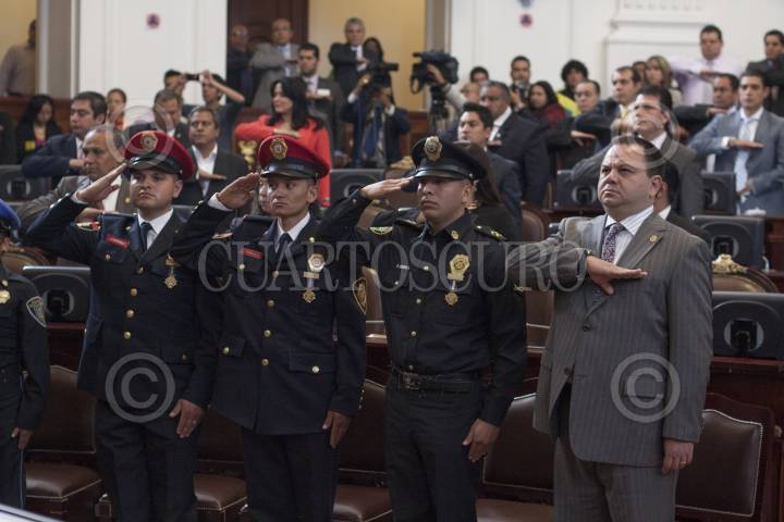 MÉXICO, D.F., 19MARZO2013.- El agente Cynthia Vázquez Martínez recibe su reconocimiento "Medalla Mérito Policial 2012" de parte de Manuel Granados Covarrubias, presidente de la Comisión de Gobierno de la Asamblea Legislativa del DF, en la sesión solemne realizada en este recinto. FOTO: MOISÉS PABLO /CUARTOSCURO.COM