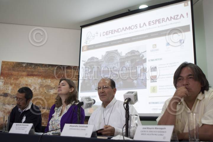 MÉXICO, D.F., 20MARZO2013.- Edgar Cortez, instituto mexicano de Derechos Humanos y Democracia A.C., Agnieszka Raczynska, red "Todos los derechos para Todas y Todos", y Alejandro Solinde, "Hermanos en el Camino", durante la presentación de la campaña nacional en favor de las defensoras y defensores de derechos humanos. FOTO: MOISÉS PABLO /CUARTOSCURO.COM